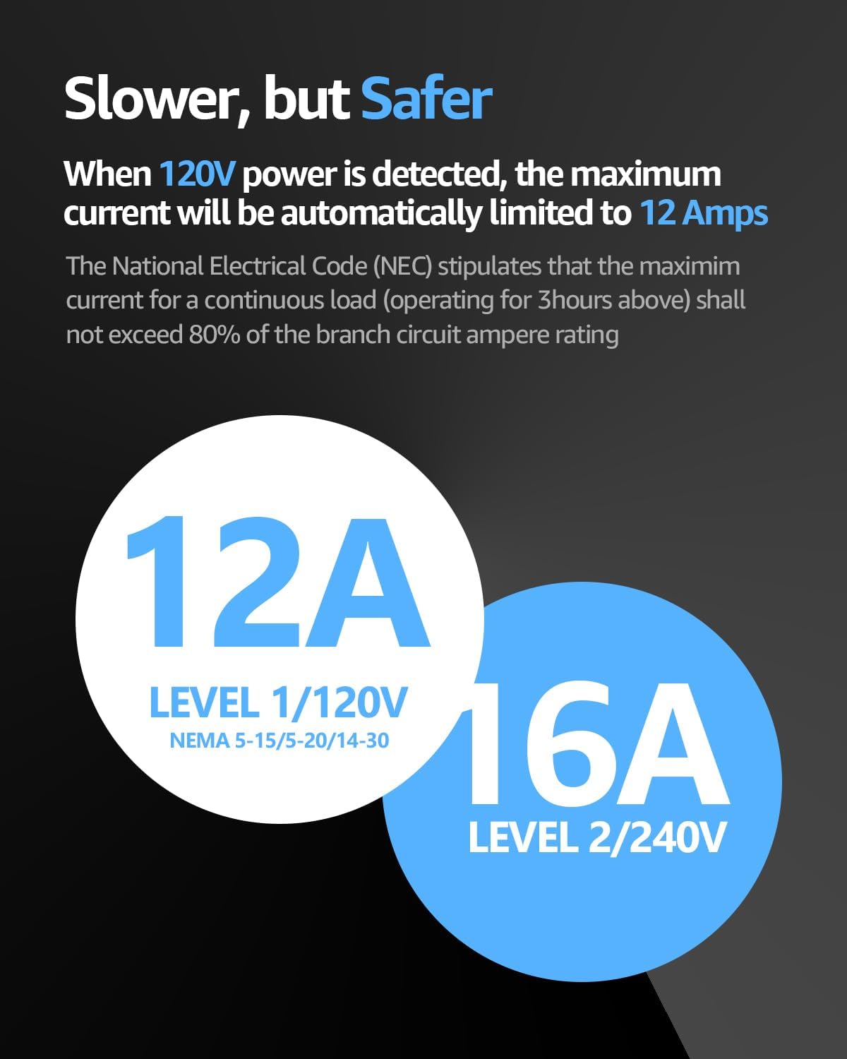 - Adjustable current settings for Level 1 (6/8/10/12A) and Level 2 (6/8/10/12/16A) charging.